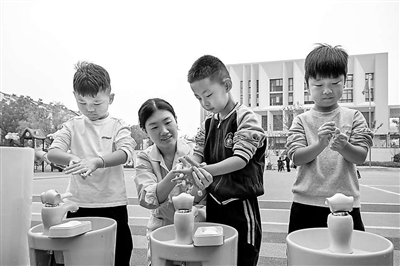 在安徽省合肥市庐阳区林店街道宿州路幼儿园云锦分园,小朋友们正在医护人员的指导下学习如何正确洗手。 赵明 摄