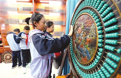 10月14日,陇西县红星小学学生在算盘非遗体验基地参观。